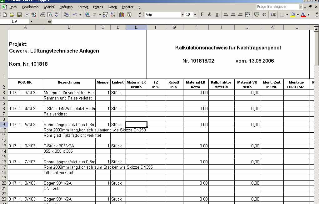 Kalkulationsnachweis Excel (Nachtragsangebot)